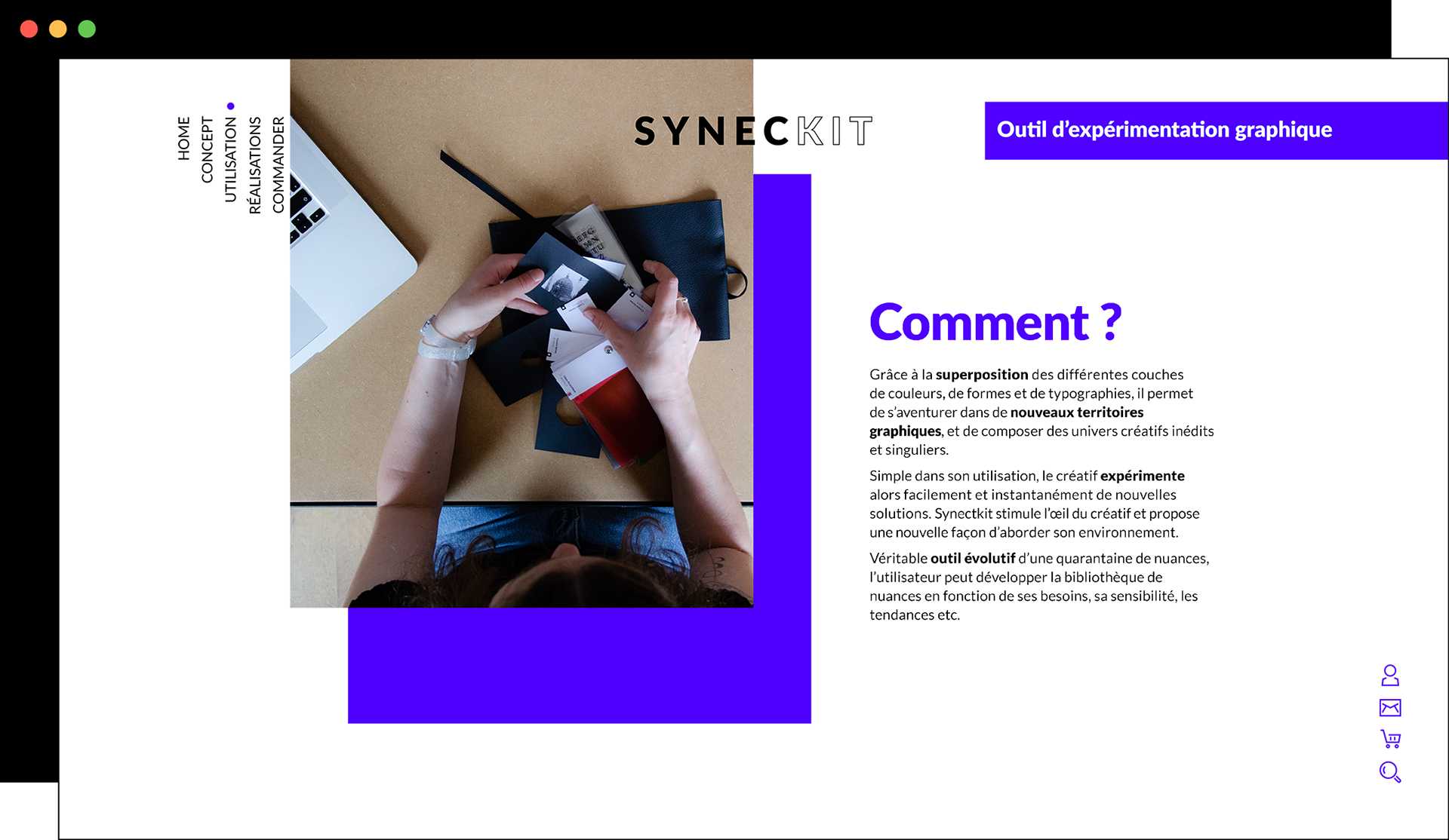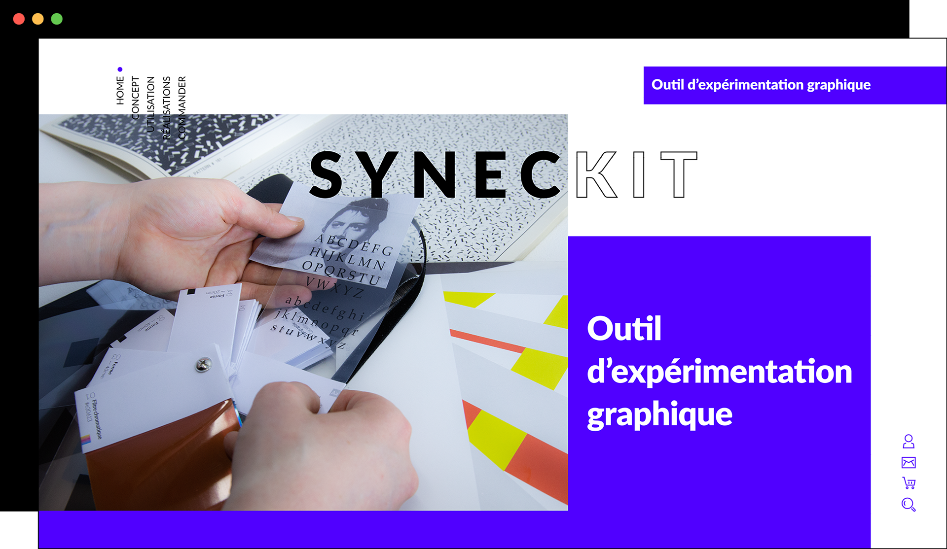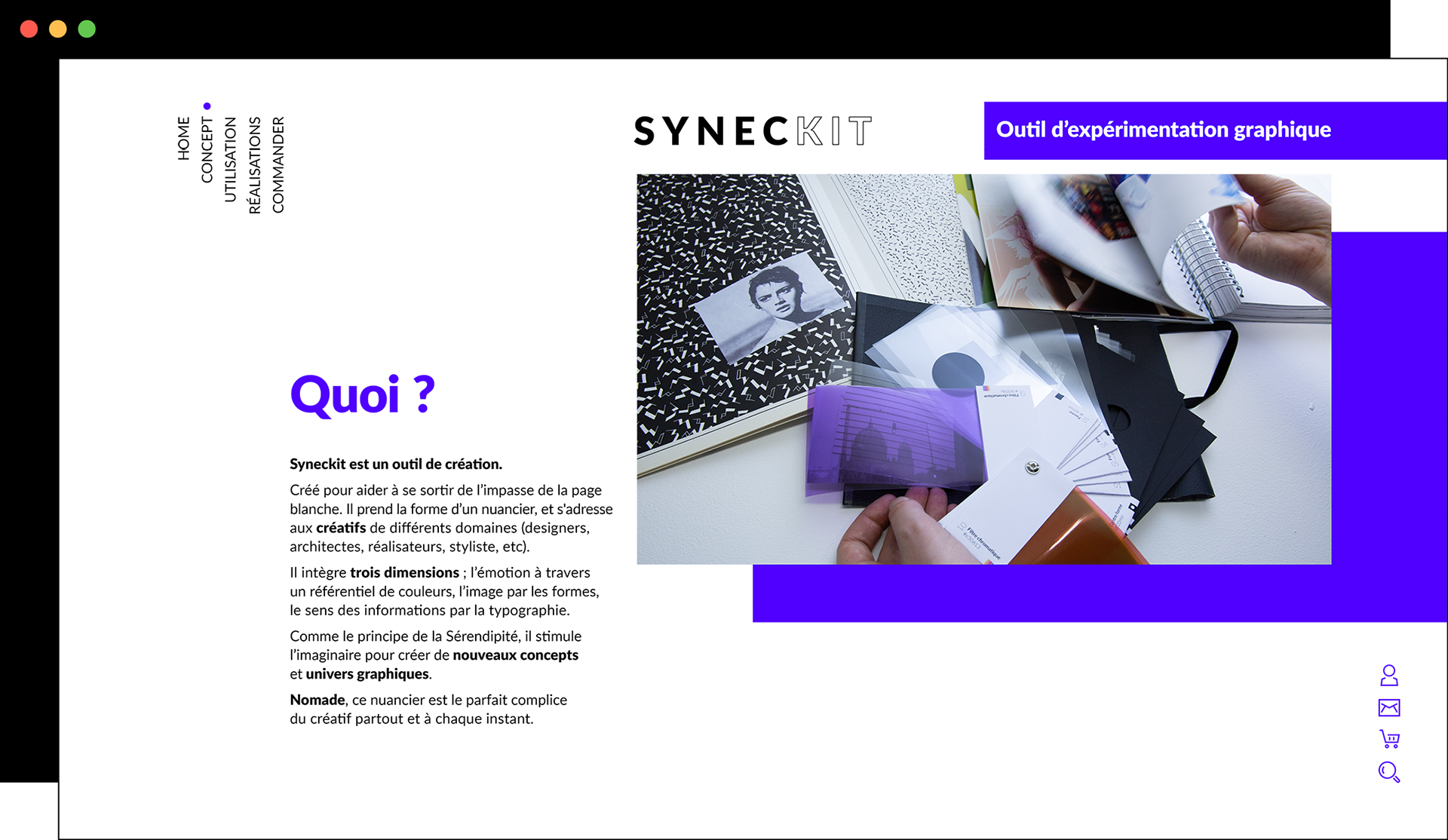 Syneckit est un outil graphique d’expérimentation conçu pour surmonter l’impasse de la page blanche. Sous la forme d’un nuancier, il s’adresse aux créatifs de tous horizons : designers, architectes, stylistes… Ce nuancier innovant associe trois dimensions : l’émotion (couleurs), l’image (formes) et le sens (typographies). Il stimule l’imaginaire, ouvre de nouveaux champs possibles et permet une approche plus libre et originale que les classiques bibliothèques d’inspiration. Nomade et pratique, il devient un allié indispensable pour libérer la créativité instantanément.